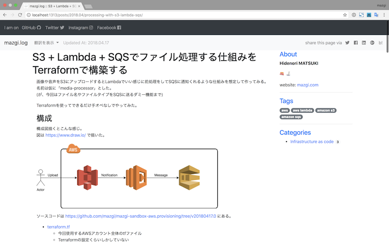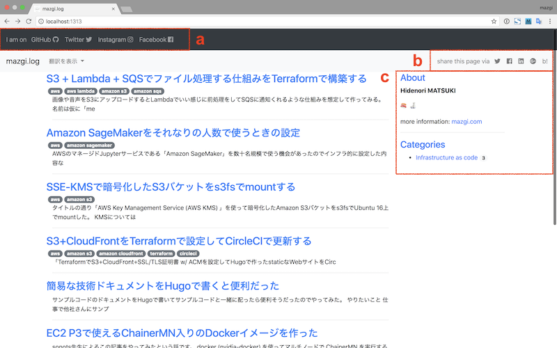 a) 用意だけして使っていなかったナビゲーションバー(黒)に SNS アカウントのリンクを表示できるようにした。config.toml にこんな感じで書くと表示される。