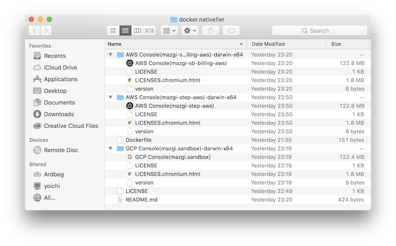 $ docker run -v $PWD:/pwd -it mazgi/nativefier nativefier --platform osx --counter --bounce --name "AWS Console(mazgi-sb-billing-aws)" console.aws.amazon.com