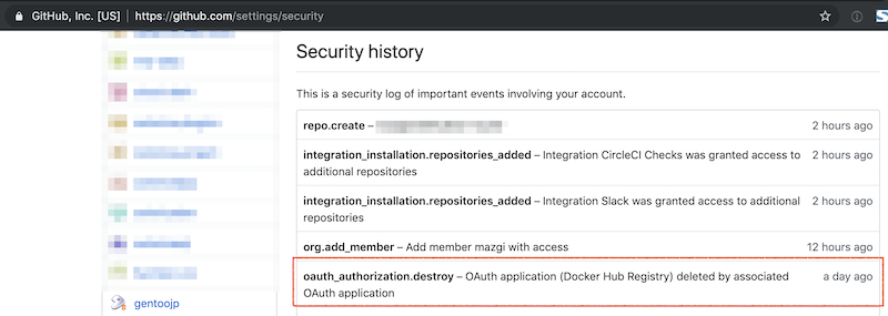 GitHub のセキュリティログを確認すると個人アカウントの方はたしかに OAuth application (Docker Hub Registry) deleted by associated OAuth application というログがあった。