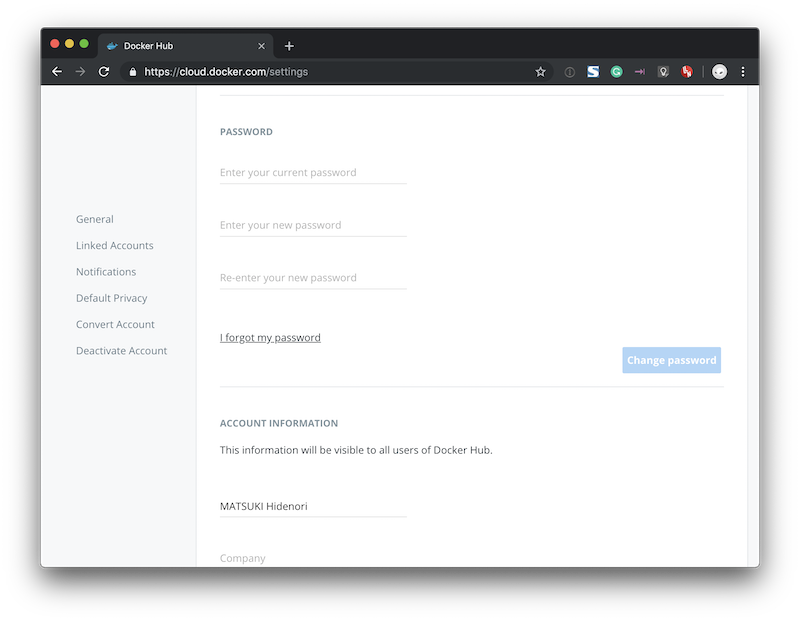 そこで私個人の Docker Hub アカウントと私が管理している会社の Docker Hub アカウント両方のパスワードを更新した。